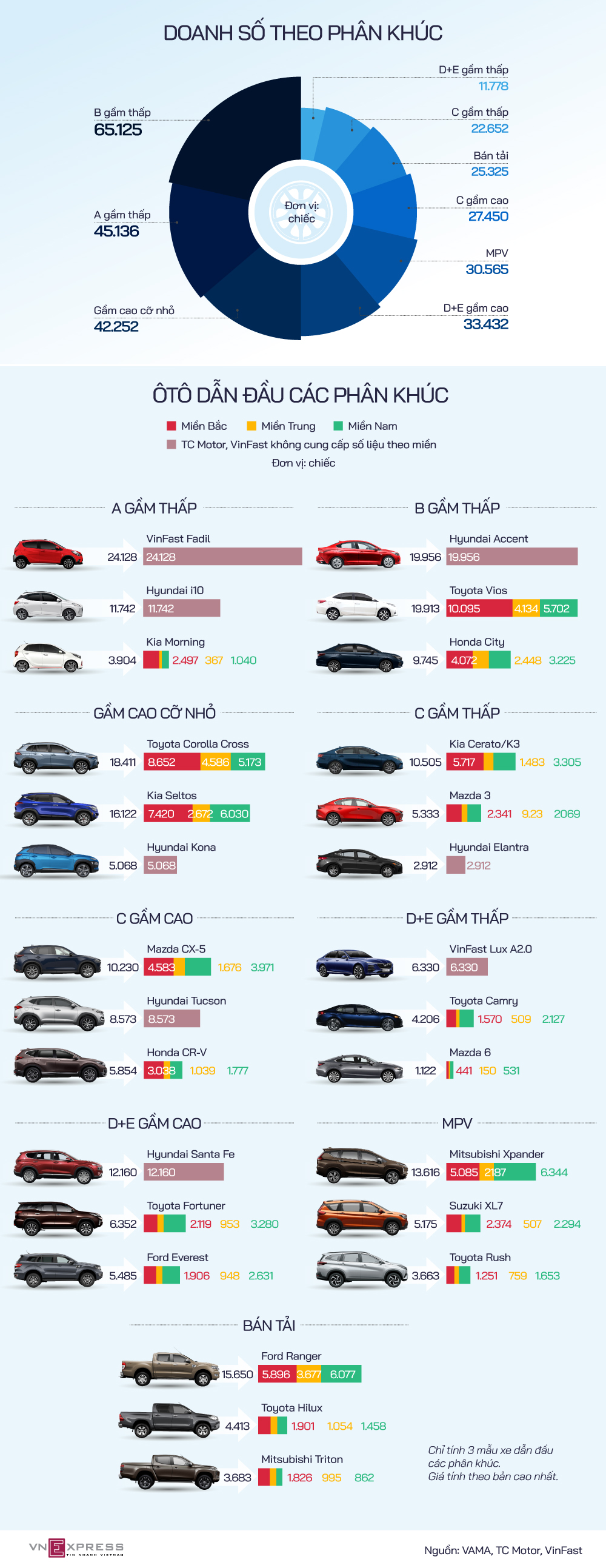 Hyundai Accent, VinFast Fadil hay Toyota Corolla Cross là những mẫu xe vô địch doanh số ở từng phân khúc.